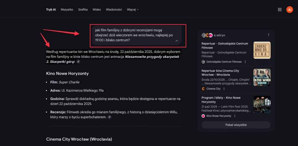 Bo jeśli dostanie gotową odpowiedź od Google AI Mode - po co miałby klikać w Twój link? Nie zobaczy Twoich promocji na popcorn i colę. Nie zobaczy wtorkowych czy weekendowych rabatów. Nie dowie się o pokazach specjalnych dla Pań ani o maratonie horrorów na Halloween. Kupi bilet (albo nie kupi) i zamknie przeglądarkę.